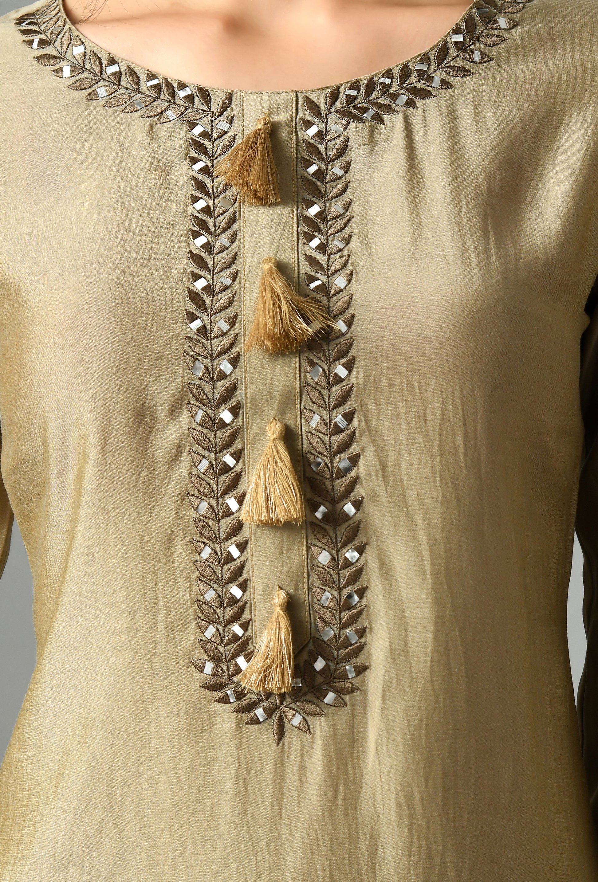 Biege Floral Yoke Design Embroidere Mirror Work Straight Kurtas With Salwar