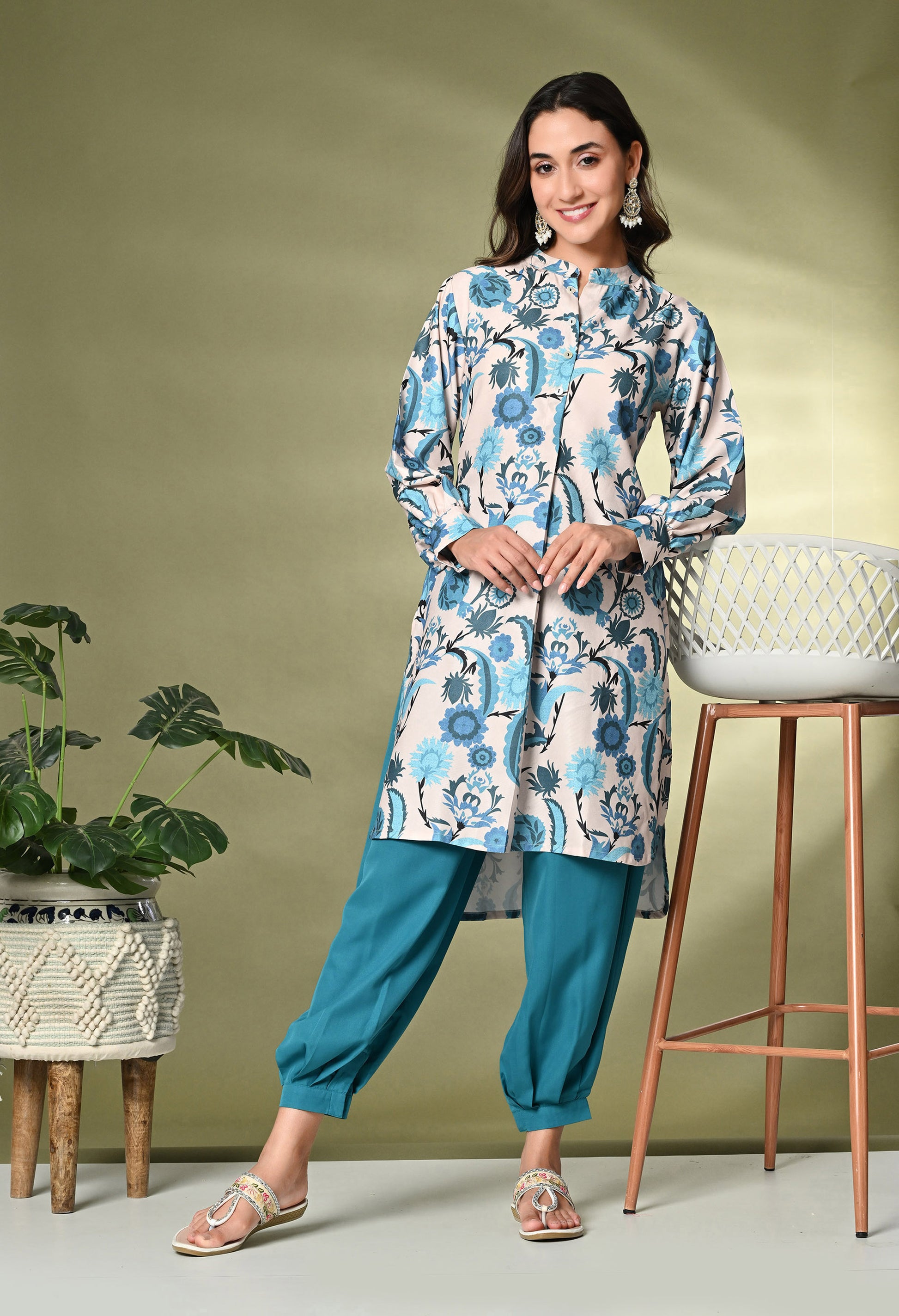 Off White & Blue Floral Printed A-Line Kurta With Salwar