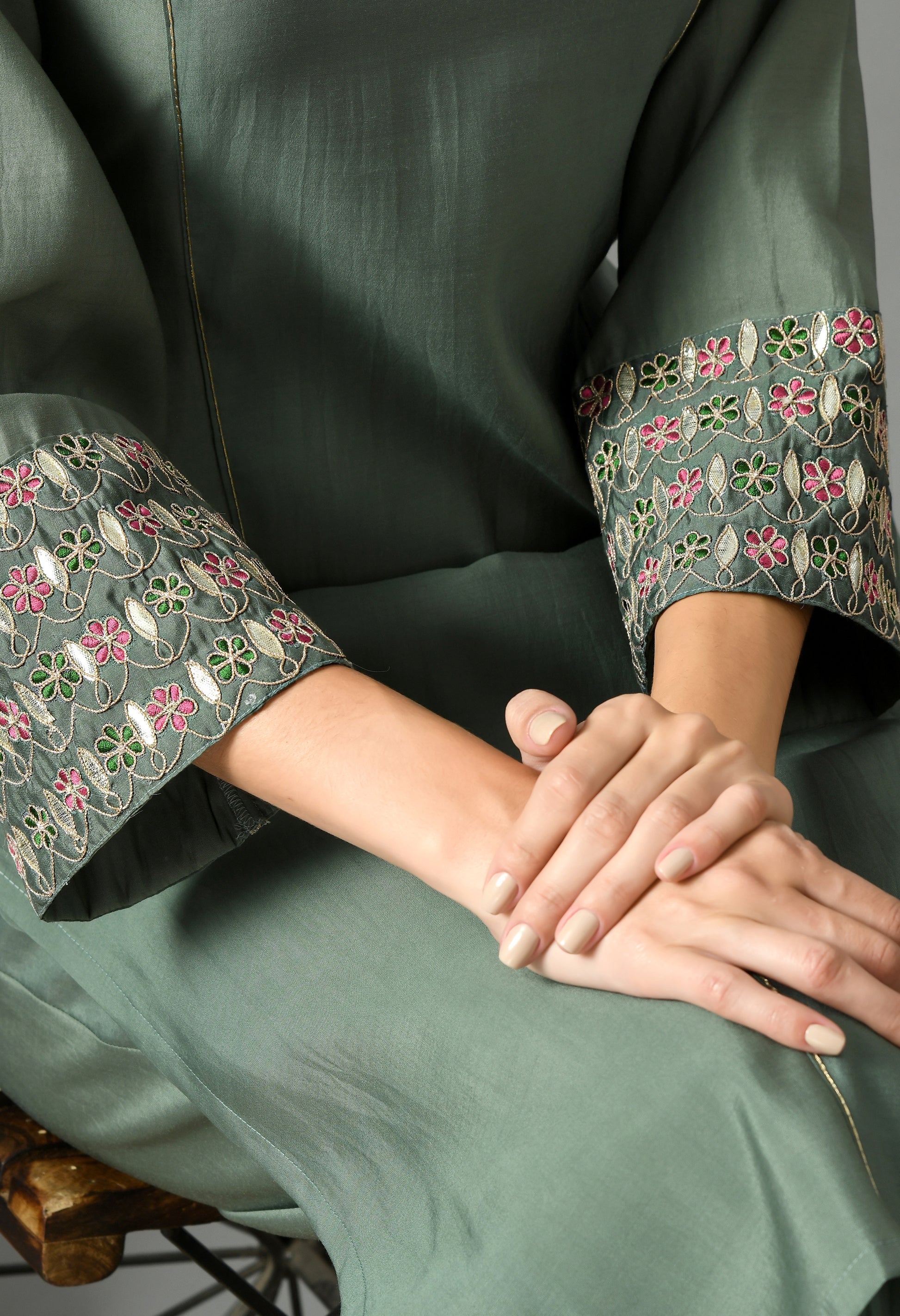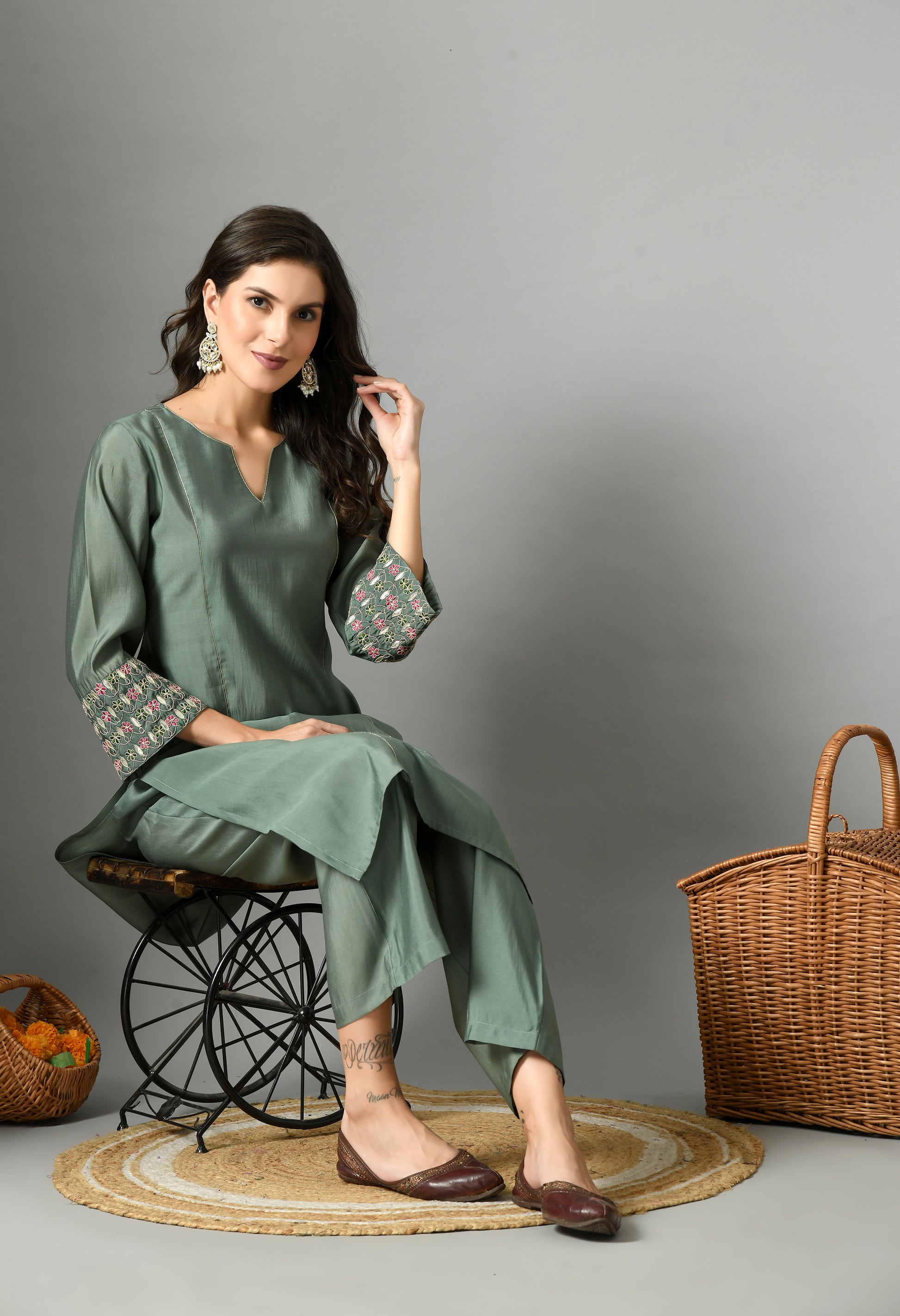 Teal Green Embroidered Notch Neck Pure Cotton Straight Kurta With Palazzos